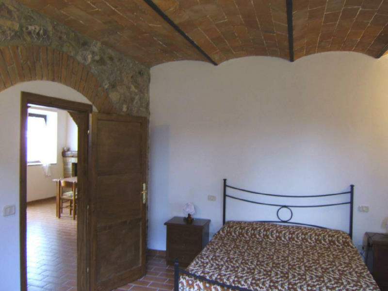 Sie ist die kleinste aber auch die netteste Wohnung. Die Wände und die gewölbte Decke sind aus Ziegelsteinen, typisch für die alten toskanischen Gutshöfe. Das Wohnzimmer ist breit und ausgestattet mit Kochecke, Kamin aus Ziegeln, Herd und toskanischem Tisch mit Stühlen. Ein großer Ziegelbogen trennt die Kochecke von dem Raum mit dem Doppelschlafsofa. Vor dem Schlafzimmer ist rechts eine Tür (hinter der Tür ist ein Wandsafe), die zum großen Bad mit Dusche führt. Hinter dem Ziegelbogen kommt man ins Doppelzimmer mit Schrank. Der Außenbereich hat einen breiten gepflasterten Bereich mit Schutzdach, wo man in Freien frühstücken oder Abend essen kann.