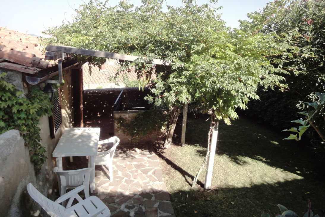 Nach 6-7 Stufen befinden Sie sich unter einer wunderschönen Laube, auf der eine große immergrüne Bignonie wächst, die mit ihren orangefarbigen Blüten im Sommer den Garten verschönert. Die Treppe gegenüber, am Fuß des Zauns, der die Gärten des Besitzers und der Gäste trennt, befinden sich große Kallas. Vom Garten genießt man den Blick auf das Dorf, den Strand und das Meer. Im Wohnzimmer mit Kochecke (Ofen, Kühlschrank mit Tiefkühlfach und alles zum Kochen) befinden sich ein Tisch mit Stühlen, eine alte Vitrine und ein Schlafsofa für eine Person. Gegenüber dem Eingang, nach dem Wohnzimmer, über 3-4 Stufen geht man ins Schlafzimmer hinunter und von hier zum Bad mit Dusche. Die ganze Einrichtung ist antik. Das Schlafzimmerfenster bietet denselben Blick des Gartens. Die Wohnung verfügt über Sat-Tv u. eine Klimaanlage, die man im Winter als Heizung benutzen kann.